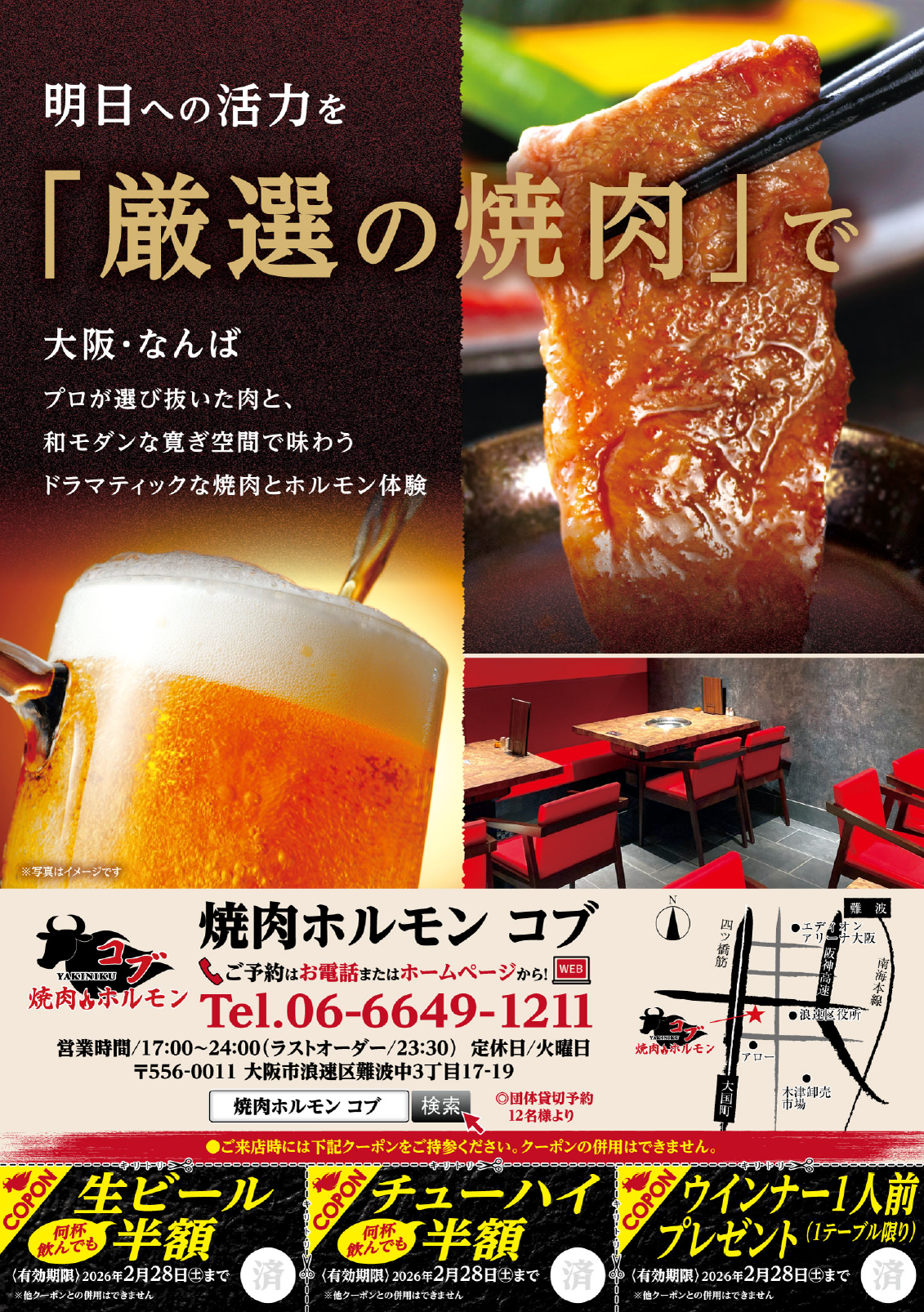 2026.02.012月限定! 厳選焼肉 食欲解放キャンペーン 脂がじゅわっとにじみ出る、その瞬間。炭の熱で焼き上がる厳選肉を、白いごはんや冷えた一杯と一緒に味わってください。焼肉ホルモン コブでは、プロが目利きした肉だけを、いちばん旨い状態でご提供しています。噛んだ瞬間に広がる肉の甘み、香ばしさ、そしてしっかり残る満足感。「今日は焼肉が食べたい」――その直感 -